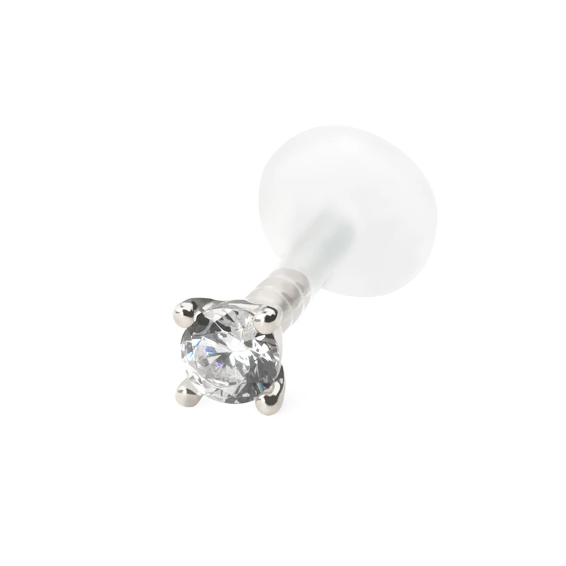 Ett exklusivt labret piercingsmycke där själva staven är gjord av det mjuka materialet bioplast som inte skadar varken tandkött eller tänderna som en kula av metall skulle göra.