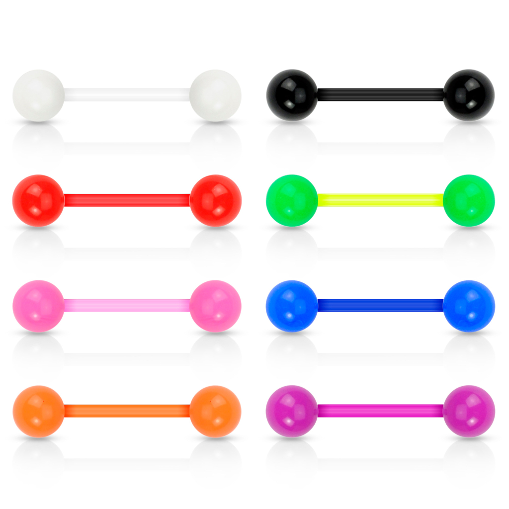 I detta erbjudande får du hela 8 tungpiercingar i varje sin färg som är gjord i PTFE/bioplas. PTFE är ett mjukt och flexibelt plast material som har adskillige fordel. Det är mycket bekvämt i brug, bara eftersom staven är flexibel och därför kommer att besvära dig din tunga minst möjlig. Slår du "kröller" på tungan kommer att staven alltså "krölle" mer. Man rör faktiskt sin tunga en hel dag varje dag så just i en tungpiercing kan det vara en enorm fördel med en stav som följer tungans rörelser.