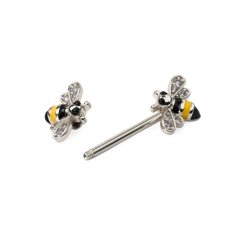 Vi har ett vackert erbjudande om du är ute efter en unik design för din bröstvårtspiercing. Smycket består av en rak barbell på 14 mm, men ha i åtanke att humlorna tar upp lite plats också.
