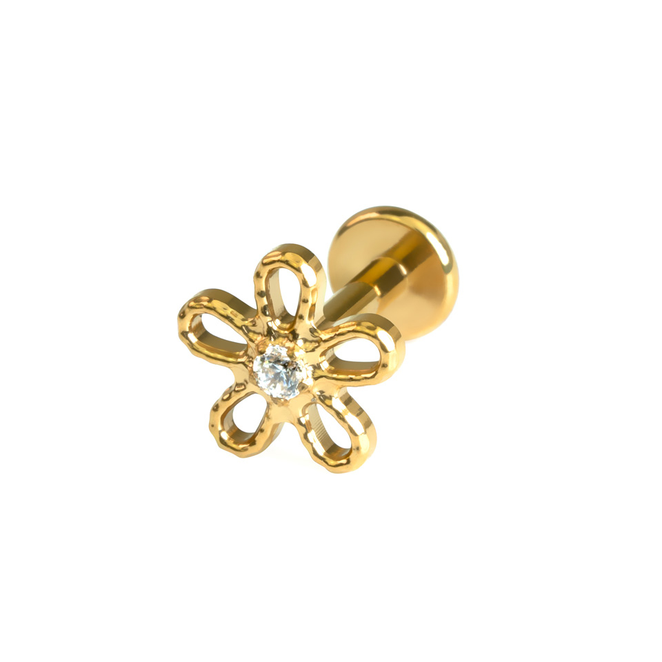 Vår förtjusande labret är formad som tusensköna med en CZ-sten i mitten för en touch av glitter. Stavens invändiga tråd gör den enkel att använda – trä helt enkelt staven genom piercingen och skruva på toppen för att låsa. Eftersom den är tillverkad av allergivänlig titan är den perfekt för känslig hud. Tillgänglig i färgerna guld eller silver, och du kan även välja den längd som passar din piercing bäst. En tusensköna som adderar en söt touch till din look.