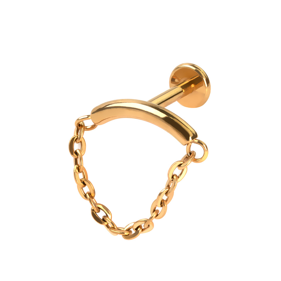 Den här labretten har en böjd stav som sitter nära ditt öra om du bär den i t.ex. din helixpiercing. Den passar också bra i örsnibben. Den har en fin kedja som fäster vid båda ändarna och hänger ned.