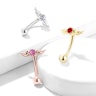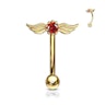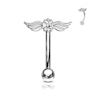 Staven du ser på bilden ovanför är en böjd stav och passar sig speciellt bra i ögonbrynet. Staven är 8 mm lång och 1,2 mm tjock. I botten av staven sitter en 3 mm stor kula som kan skruvas av och på. I toppen av staven är det inte en kula som man normalt ser. Istället för en kula är det ängalvingar som sträcker sig till varje sida. I mitten av vingarna sitter en snygg sten, som allt efter ditt val av materialfärg också är annorlunda.