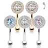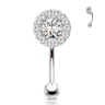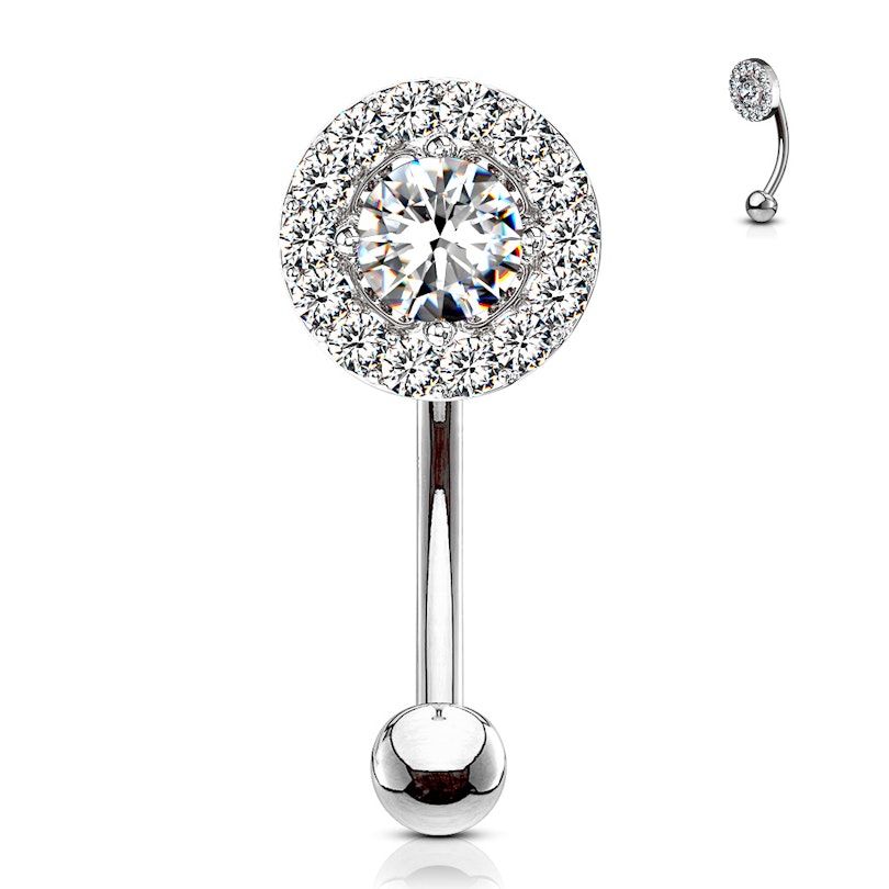 Med denna böjda stav får du ett smycke som är mycket iögonfallande med sin stora glimtande centersten, som du också kan välja färg på. Stenen sitter på en rund platta av mässing som har blivit belagd för att matcha staven den sitter på.