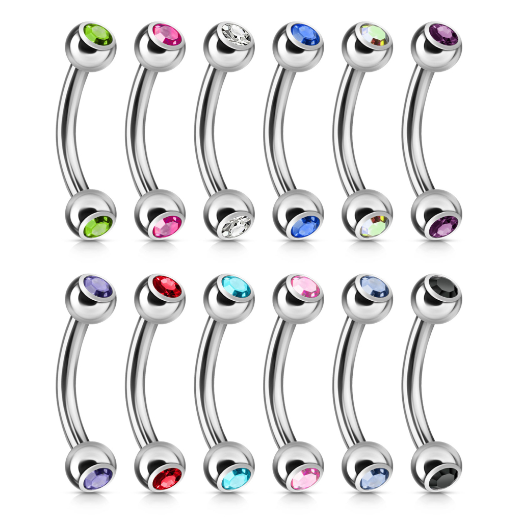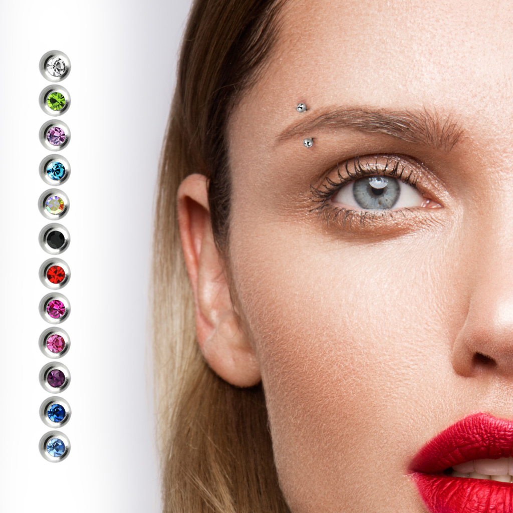 De två kulorna på varje ände har en diameter på 3 mm (1/8"). Det är en mycket diskret storlek om du vill använda den i din ögonbrynpiercing. Båda kulorna har en bezel-set pärla som inte sticker ut. Du kan välja pärlan i flera olika färger, välj din favorit.