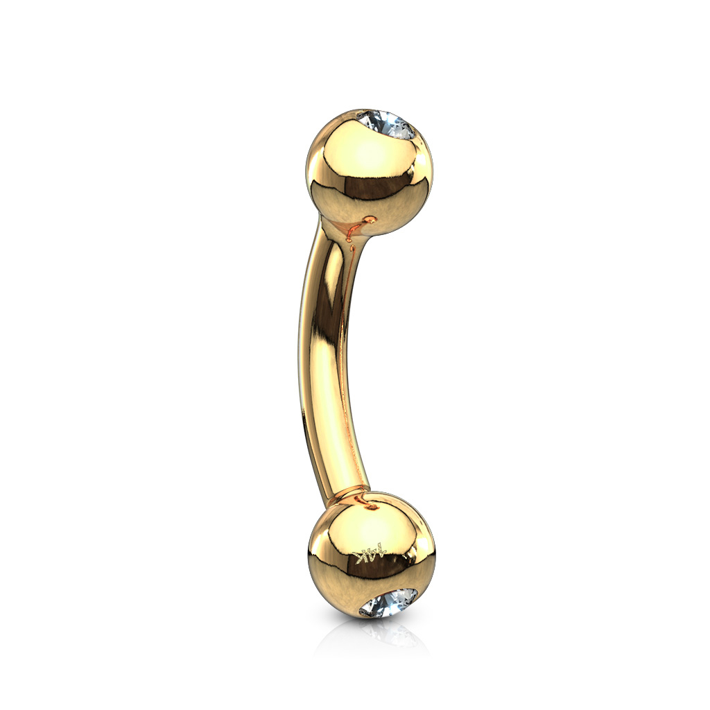 Vacker och feminin böjd stav av 14 karat guld med en gnistrande klar sten i bägge kulor som är monterad i slutet. Denna stav är perfekt för dig som gillar det tidlösa klassiska looken med ett diskret rör av graciös elegans. Staven här är som en ung tjej som visar sin skönhet till världen med nedslåede ögon - framför att föra sig fram som en popsmart prinsessa. Den är diskret, tidlös och feminin på en ytterst raffinerad sätt. Staven finns i två olika längder som kan väljas innan du lägger varan i korgen.