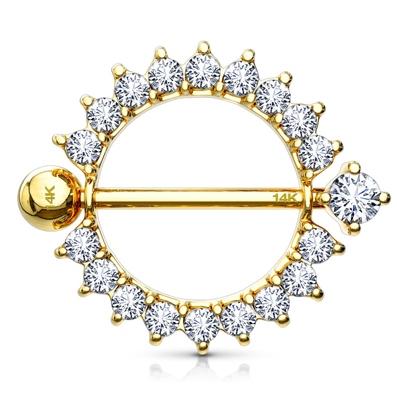 Saknar du ett exklusivt bröstsmycke till din bröstpiercing? Nu har du möjligheten att pryda ditt bröst med ett smycke av 14 karat guld, med vackra klara stenar hela vägen runt sköldens kant. Smycket är designat som att det ligger en liten sol där de många glittrande stenarna skiner tillsammans. Varenda sten är direkt insatta i guldet och är inte fastlimmade.