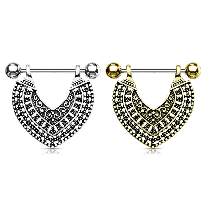 På bilden ovanför hittar du en bröstpiercing till dig som älskar antika mönster. Även om antikviteter oftast är för utställning, rekommenderar vi inte att du visar din nya bröstpiercing i det offentliga rummet.