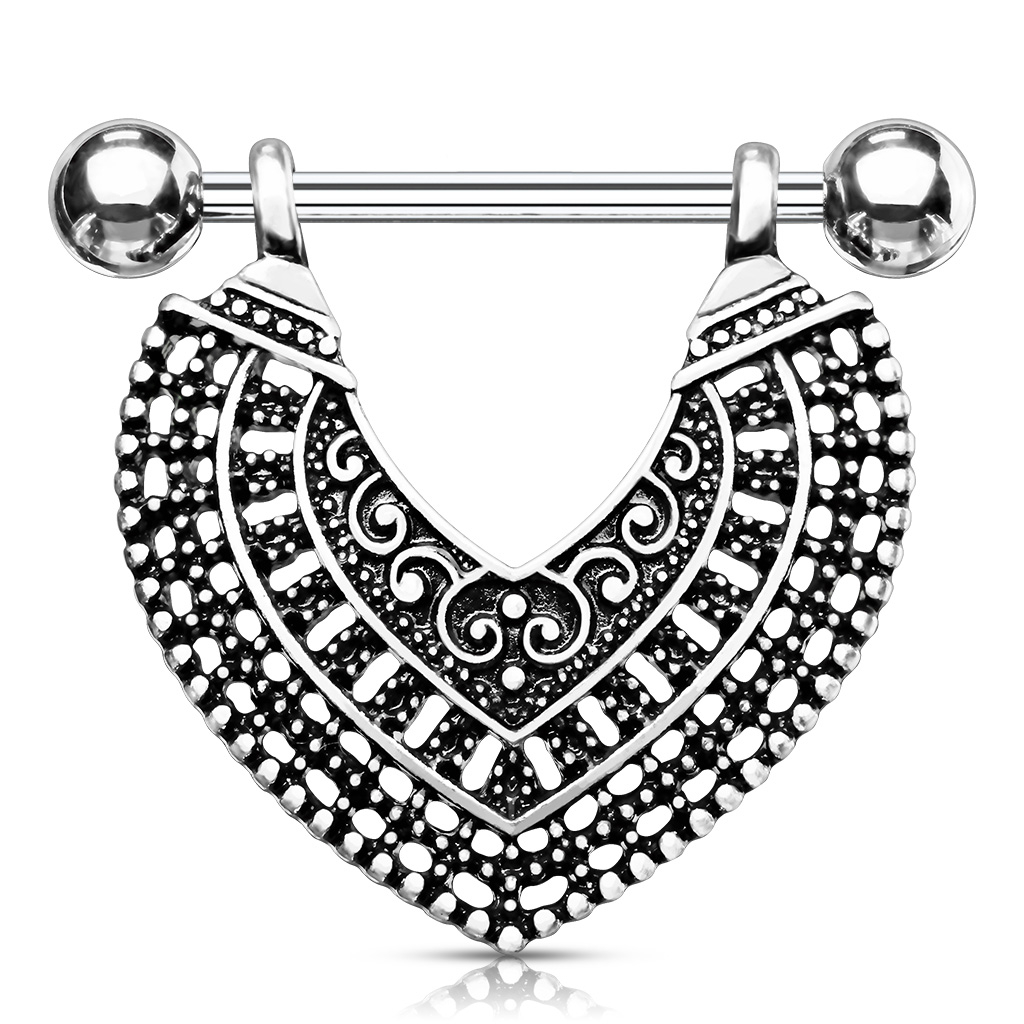 På bilden ovanför hittar du en bröstpiercing till dig som älskar antika mönster. Även om antikviteter oftast är för utställning, rekommenderar vi inte att du visar din nya bröstpiercing i det offentliga rummet.