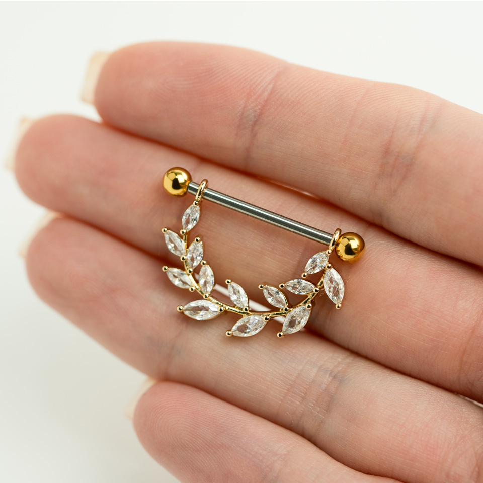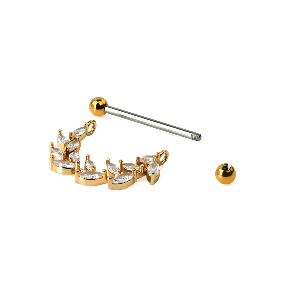 Det här bröstsmycket är perfekt för dig som tycker om lite mer feminina designer. Det här smycket består av en rak stav, precis som man brukar se i en vanlig piercingstav. Staven har dock en kula i varje ände. Kulorna kan skruvas av (samt bytas ut om du skulle vilja göra det). På staven hänger det också ett hänge. Hänget är vackert enkelt och består av marquise-slipade stenar som tillsammans skapar en design som föreställer små blad. Stenarna hänger likt blad på en gren där de sitter fast i en fin klump i varje ände av bladet.