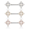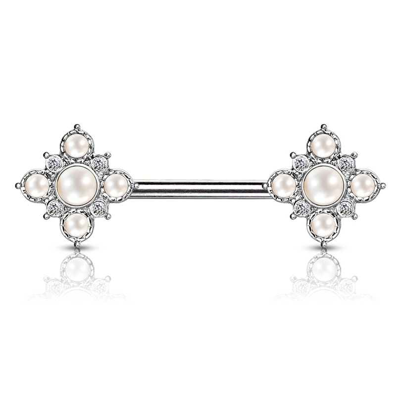 Smycket är till dig med en bröstpiercing - eller en piercing i ett bröst. Smycket består kort sagt av en stav av kirurgiskt stål. Den mäter mellan blommorna ca. 12 mm. Om det är blommor eller inte låter vi dig bestämma, men med en smula fantasi kan man se den stora pärlan som blommans centrum och de fyra mindre pärlorna som blommornas blad.