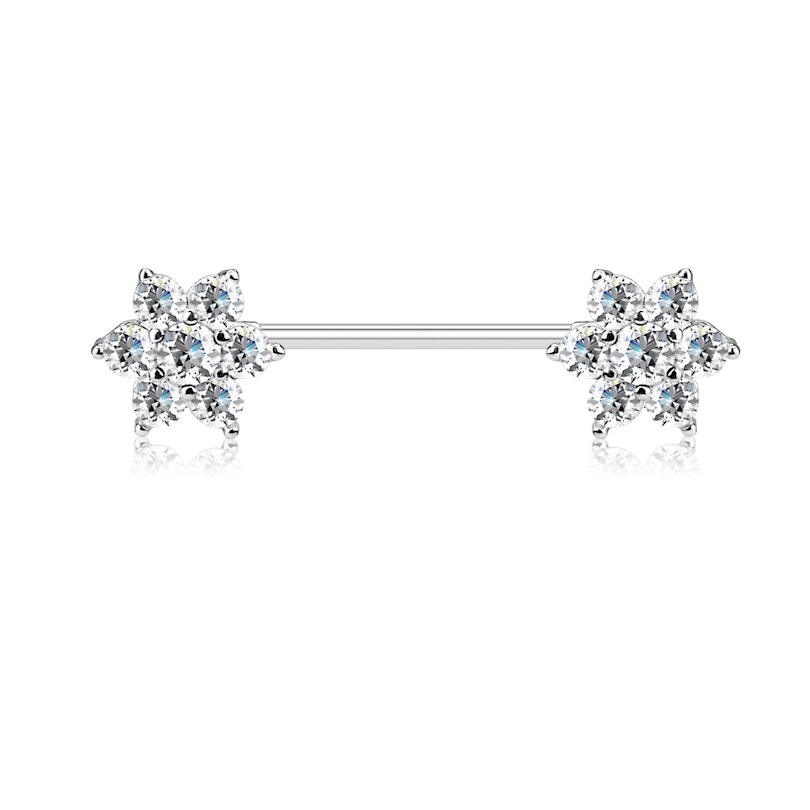 Superfin och elegant bröstpiercing med vackra gnistrande blommor på båda sidorna av staven. Blommorna kommer i olika färger, så du väljer helt själv vilken som passar dig bäst.