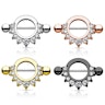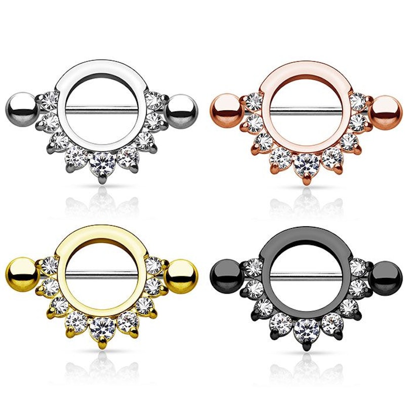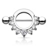 Är det tid att skämma bort din bröstpiercing med ett pirrande nytt smycke så är denna vackra bröstsköld kanske just det du letar efter. Denna bröstpiercing består av en stav som går igenom en låst ring, varav den nedersta delen av ringen är formad som en snygg stendekorerad halvmåne. Bågen rymmer alla dom vackra droppformade stenarna som tillsammans skapar den snygga halvmånen.