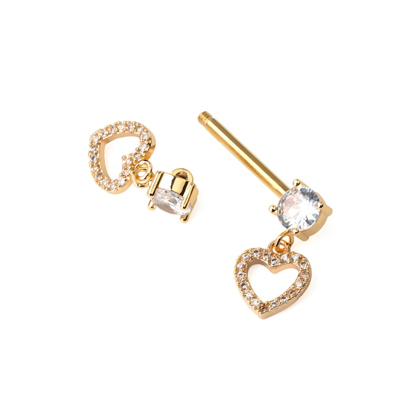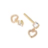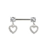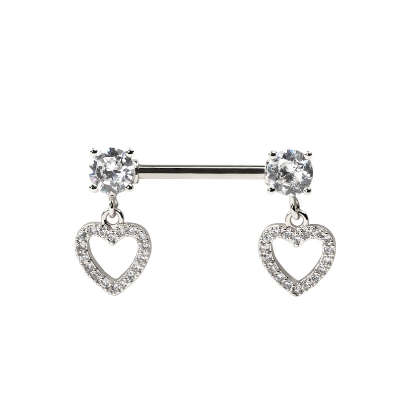 Denna vackra bröstpiercing har en CZ-sten i varje ände varpå det hänger hjärtformade berlocker, även dessa prydda med små CZ-stenar.