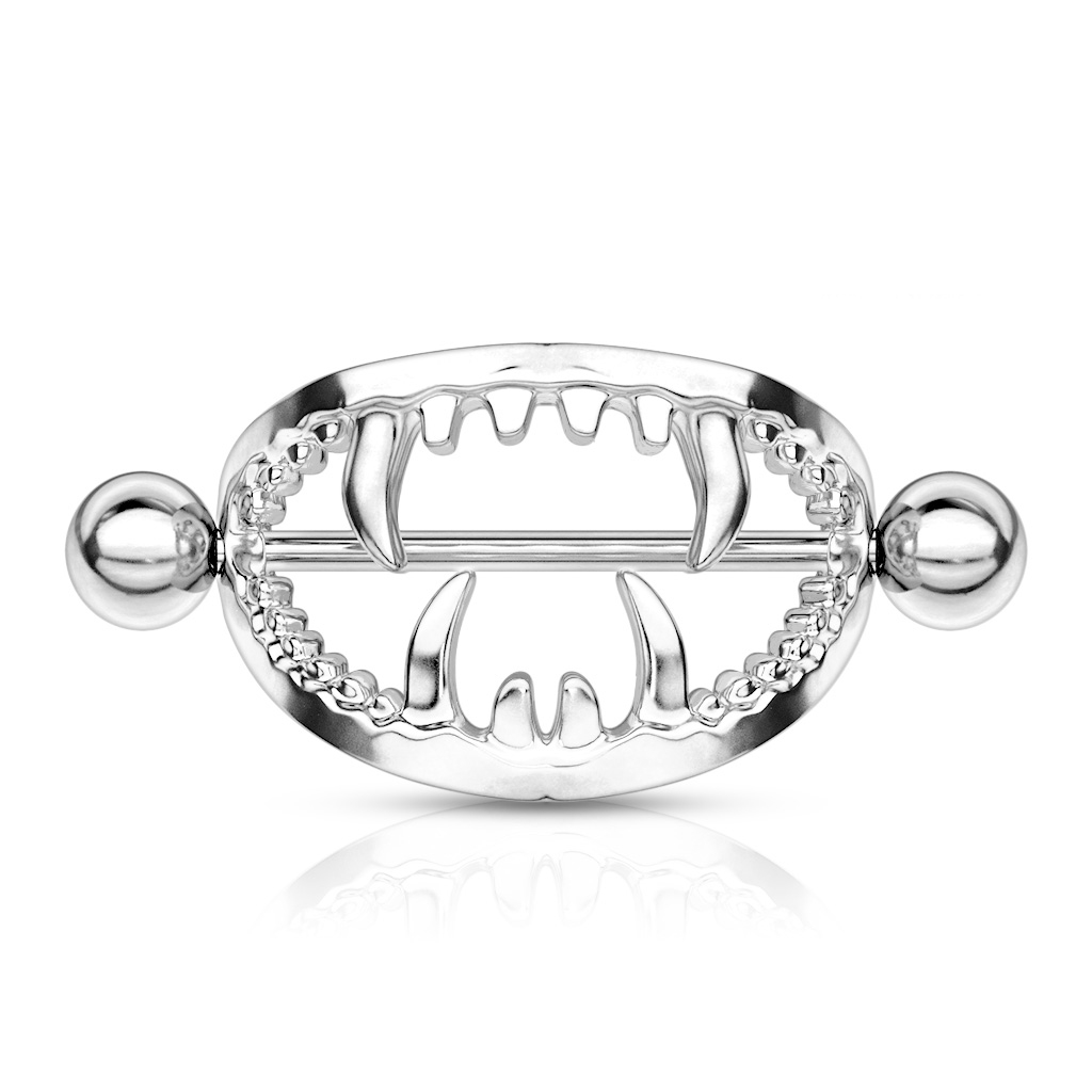 Denna bröstpiercing är en munsbit. Den består av en stav av kirurgiskt stål som går från mungipan till mungipan på en tandbyggnad med stora huggtänder. När du bär smycket kommer det se ut som om din bröstvårta sitter inne i munnen. Munnen är gjord av mässing som är belagd med rodium så att den får samma färg som staven och kulorna. Det fria stycker på insidan är ca 18 mm och från staven och ut till insidan av munnen är det omkring 8 mm. Så du bör nog mäta innan du köper smycket.