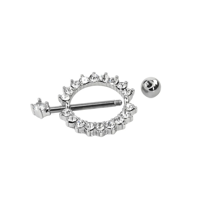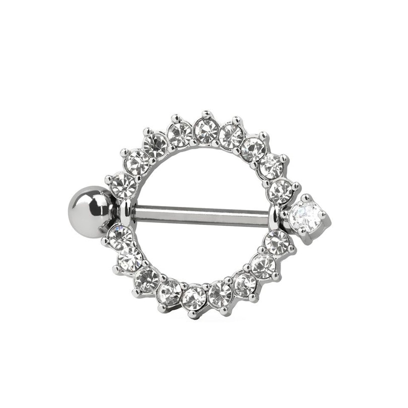 Namn: Bröstpiercing med rund sköld och klara stenar