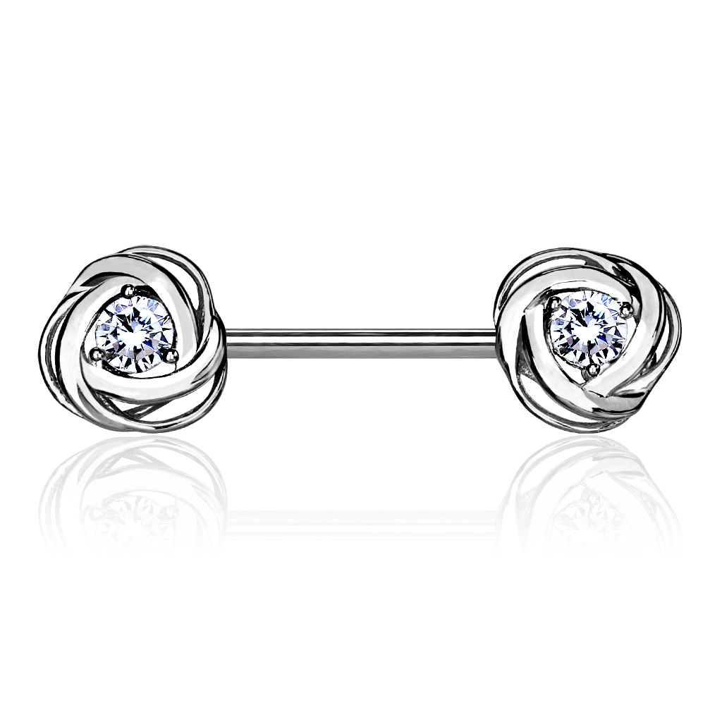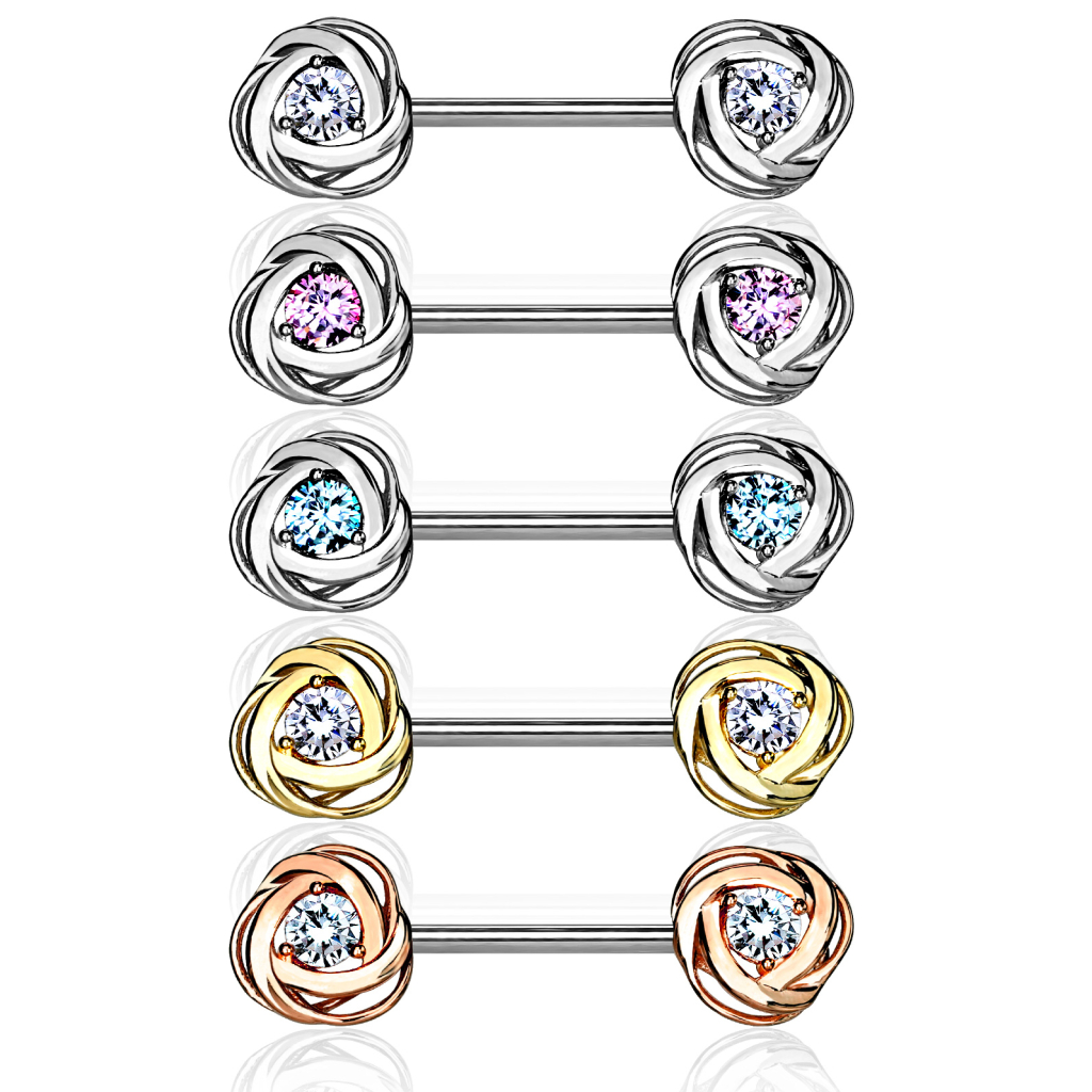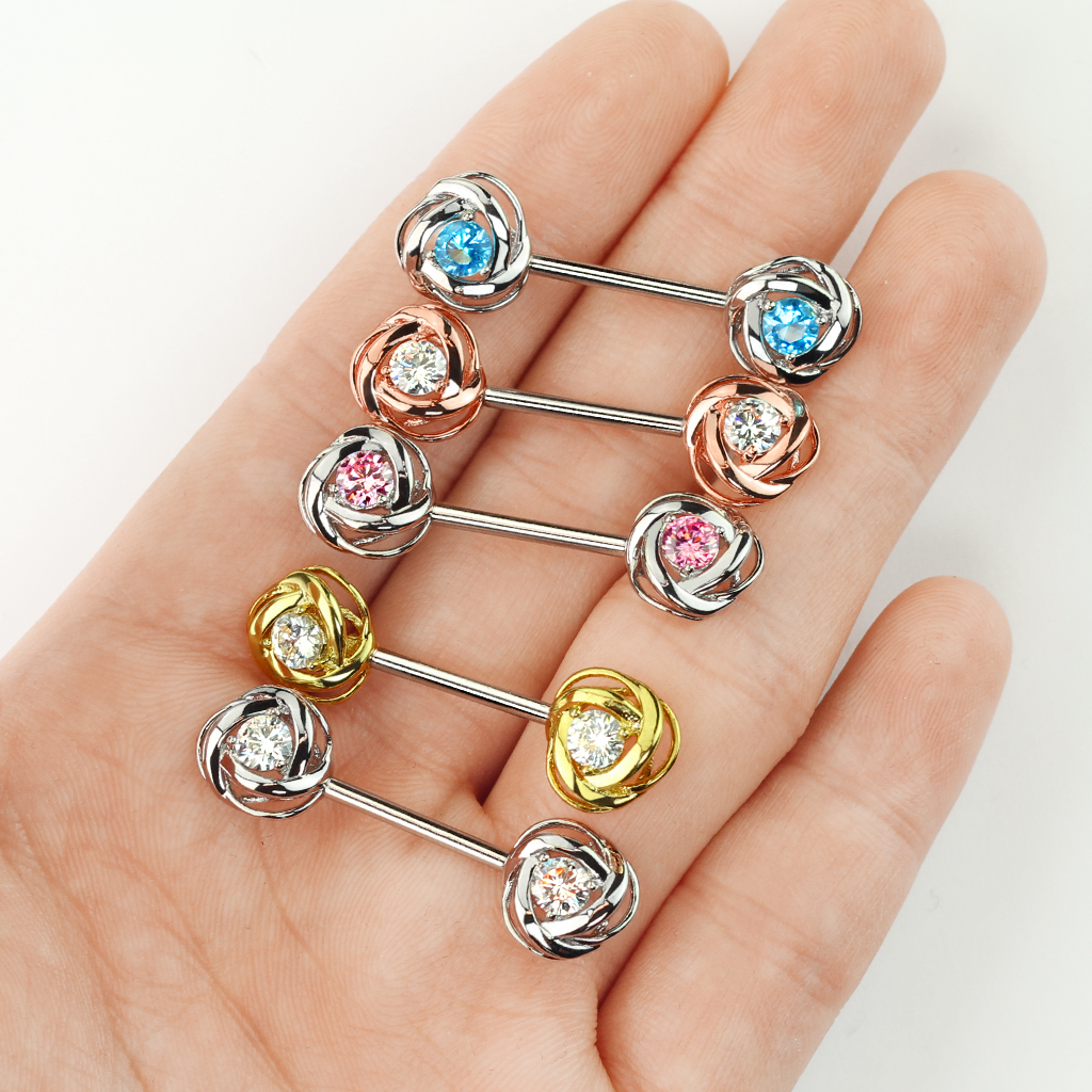 Du har precis klickat in dig på denna lilla snygga och fräcka bröstpiercing som kan ses på bilden ovanför. Smycket är gjort av kirurgiskt stål. Smycket har en ros i varje ände av staven som är gjort av mässing. Varje ros har en sten fäst i mitten av blomman. Rosen på smycket är belagt – den blanka utgåvan med en silverfärgad beläggning, och guldvarianterna med en beläggning av 14 karat guld.
