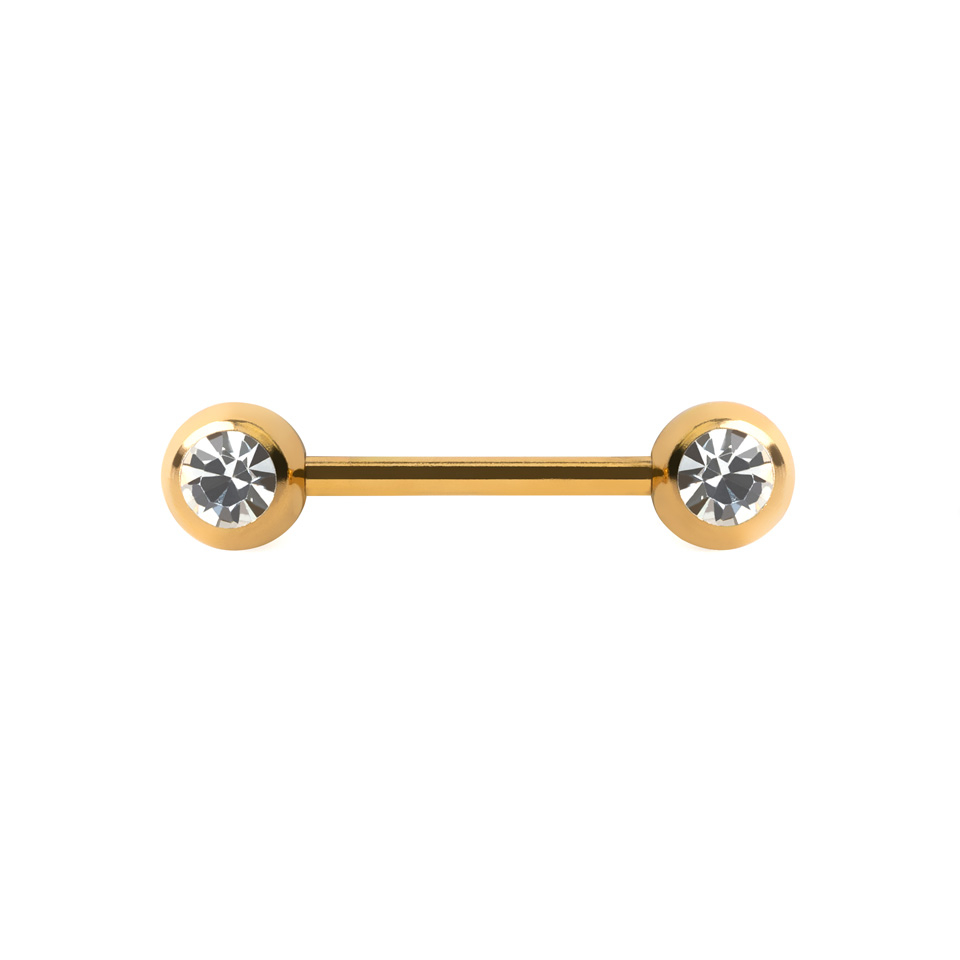 Smycket är utrustad med en stor snygg 6 mm. låskula i varje ände. Det är inte kulor som är menade att vara diskreta, nej dessa snygga kulor är födda till uppmärksamhet. Utöver att vara färgad i samma nyans som själva staven är de nämligen också bägge utrustade med en skinande vacker klar sten. Stenarna är cirkelrundade och har form som en diamant så de glittrar och glimtar mest möjligt när ljuset faller på dem.
