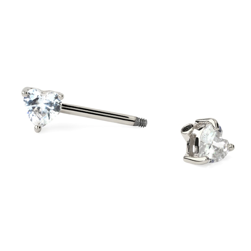 Den ena hjärtformade stenen kan skruvas av, så smycket fort och enkelt kan sättas i, därefter skruvas stenen på igen. Smycket har en trådstorlek på 1,6 mm och en längd på 12 mm. Det vill säga att den enda valmöjligheten du har är färgen, måtten på smyckena är likadant på alla modeller.
