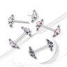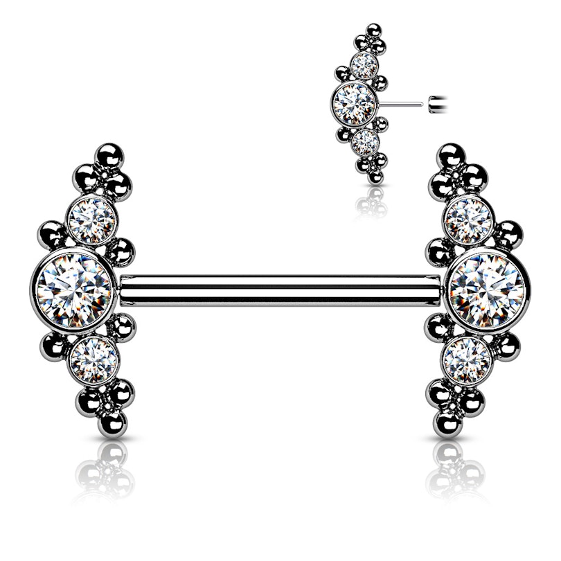 Kvalitet eftersom smycket är gjord helt av titan, både staven och klusteränden. De är en klunga eftersom de består av en grupp av både stenar och små sfärer. Det sitter en större sten i mitten och två mindre bredvid. De mindre sfärerna sitter bredvid stenarna vilket gör att hela smycket ser ut som en kluster av stenar och kulor. Stenarna är placerade på stålet, vilket är platt på baksidan. Därför ligger smycket på ditt bröst beroende på vart piercingen gjordes på din bröstvårta.