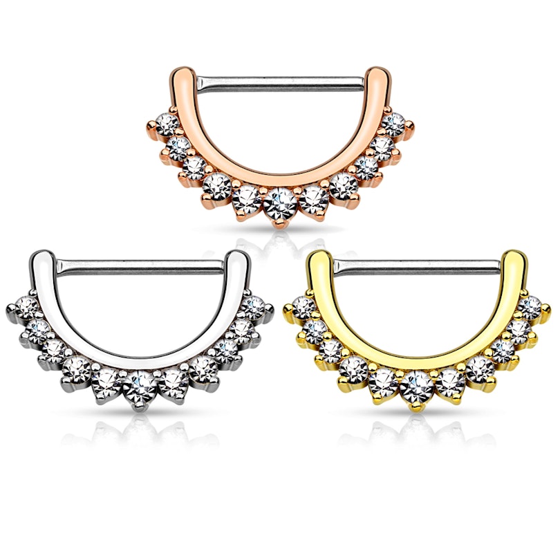 Som skrivet finns denna nippleclicker i tre varianter där endast färgen är olik. Välj mellan en simplistisk blank version, en enkel gyllene guldfärgad version eller den mer moderna rödguldsversionen. Oavsett färgval kommer du garanterat inte ångra detta smycke som med sina 11 klara stenar skapar en snygg klar halvmåne under bröstvårtan.