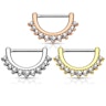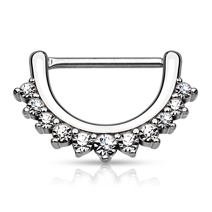 En nippleclicker är som namnet antyder en "clicker" som förs genom bröstvårtan. Om du är piercad i båda bröstvårtorna så kan du använda detta smycke. Staven är 1,6 mm. tjock och ca. 12 mm. lång och finns i tre färgvarianter. Utöver färgen är varianterna 100% identiska, så det handlar alltså endast om färgpreferens. Designen lutar mer åt den feminina sidan med sina många små klara stenar.