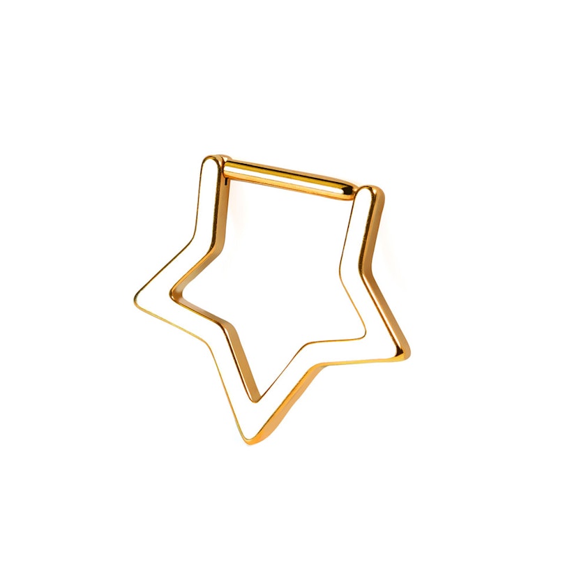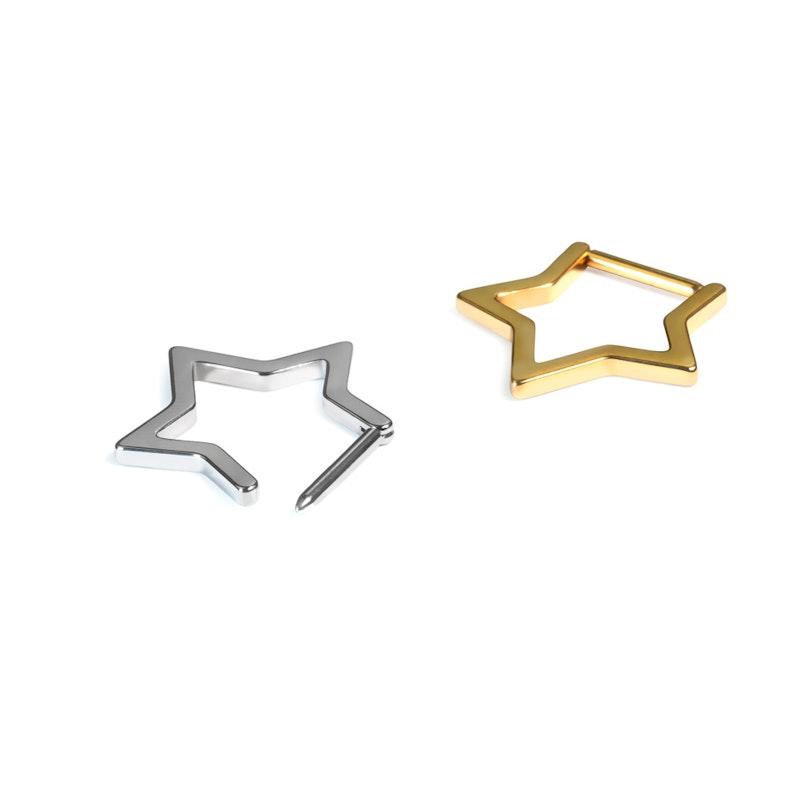 Denna clickerring i titan i form av en stjärna är perfekt för flera olika piercingar. Till exempel skulle den se fantastisk ut i en septum, helix, öronsnibb eller rook piercing. Eftersom den är tillverkad av tålig titan är den vattentät, snäll mot känslig hud och gjord för att hålla. Öppningen är som ett gångjärn, vilket gör den enkel att sätta i din piercing. Smycket är faktiskt ihåligt, vilket gör att den kan ha ett grövre utseende men ändå vara superlätt och bekväm att använda.