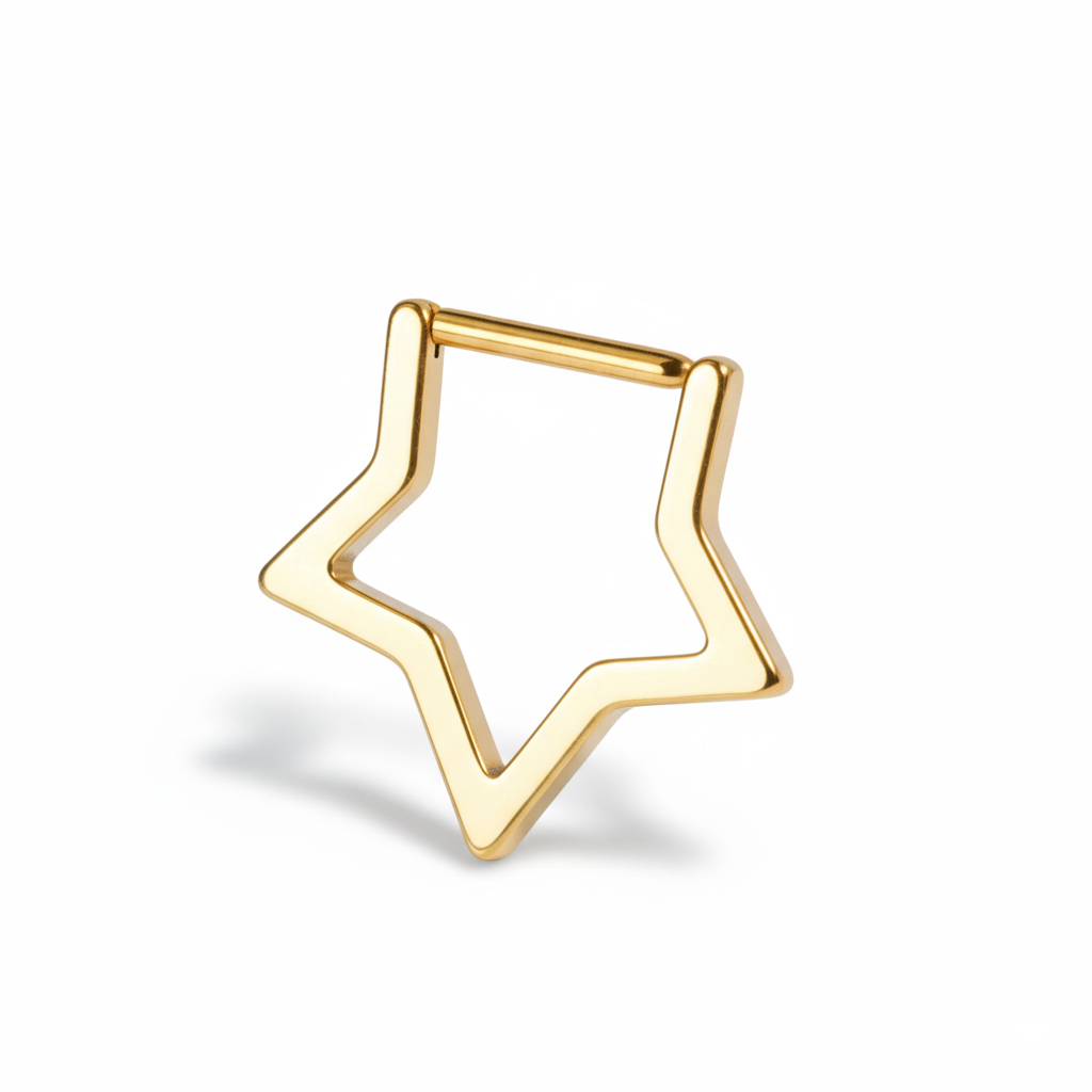 Denna clickerring i titan i form av en stjärna är perfekt för flera olika piercingar. Till exempel skulle den se fantastisk ut i en septum, helix, öronsnibb eller rook piercing. Eftersom den är tillverkad av tålig titan är den vattentät, snäll mot känslig hud och gjord för att hålla. Öppningen är som ett gångjärn, vilket gör den enkel att sätta i din piercing. Smycket är faktiskt ihåligt, vilket gör att den kan ha ett grövre utseende men ändå vara superlätt och bekväm att använda.
