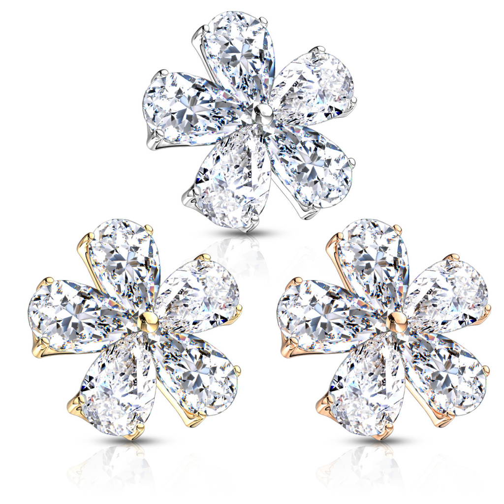 Smycket som du har klickat dig in på är en dermal som är formad som en blomma och har dekorerats med fem droppformade stenar som föreställer blommornas blad. Blomman är gjort av mässing och därefter belagts för att ge smycket en snygg färg – du kan välja mellan flera färger, bland annat guld och rosaguld. Smycket är inte bara gjort av mässing. På baksidan av smycket sitter det en liten skruv som är gjort av kirurgiskt stål.