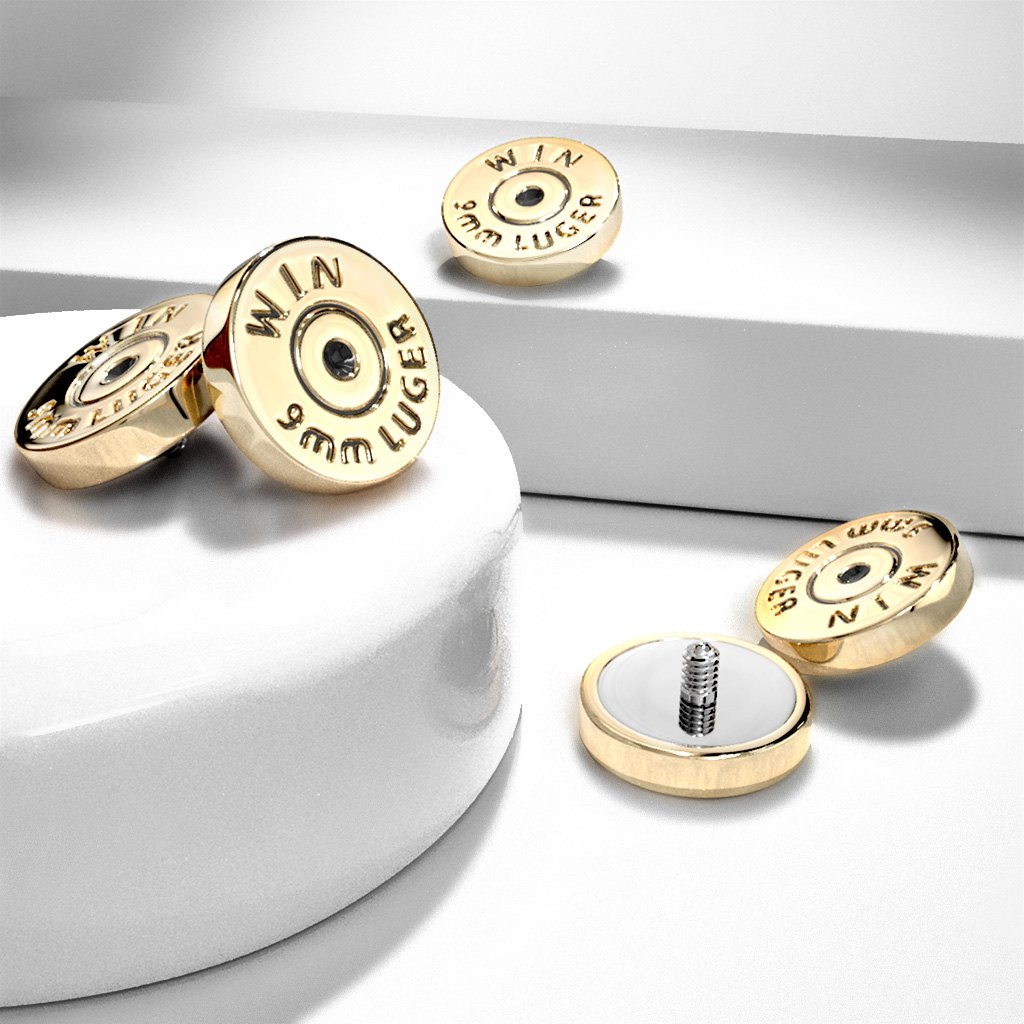 Piercingsmycket är tillverkat av kirurgisk stål och här är det viktigt att den delen som ska ner i basen kommer .i kontakt med huden. Patronen är tillverkad av mässig och har pläterats med en guldfärg så att den liknar en riktig patron. Piercingsmycket är ca. 7 mm. och därför får också den snygga ingraverade texten plats, vilket du kan se på bilden ovan.
