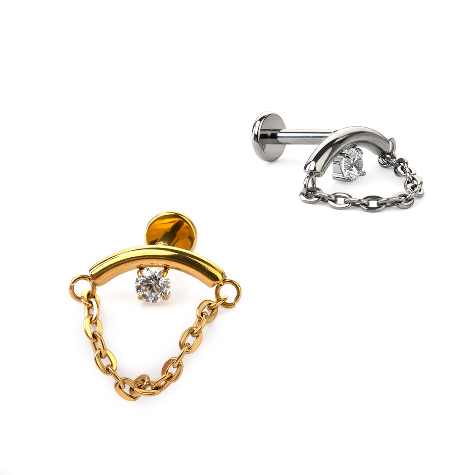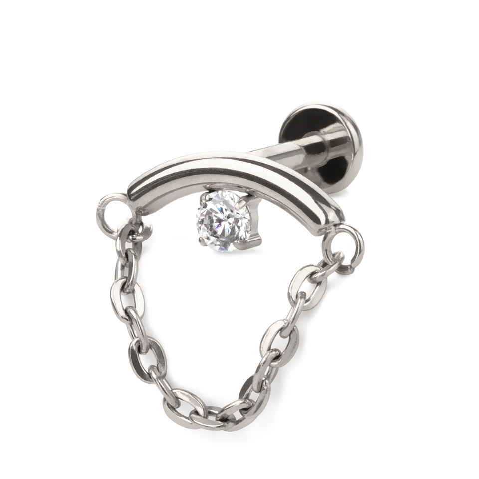 Den här labretten i titan har en böjd stav med en kedja som hänger från båda ändarna. Den har en CZ-sten med bezelsättning i mitten av staven. Bär den horisontellt i din örsnibb, eller i en helixpiercing där den följer ditt öras båge.
