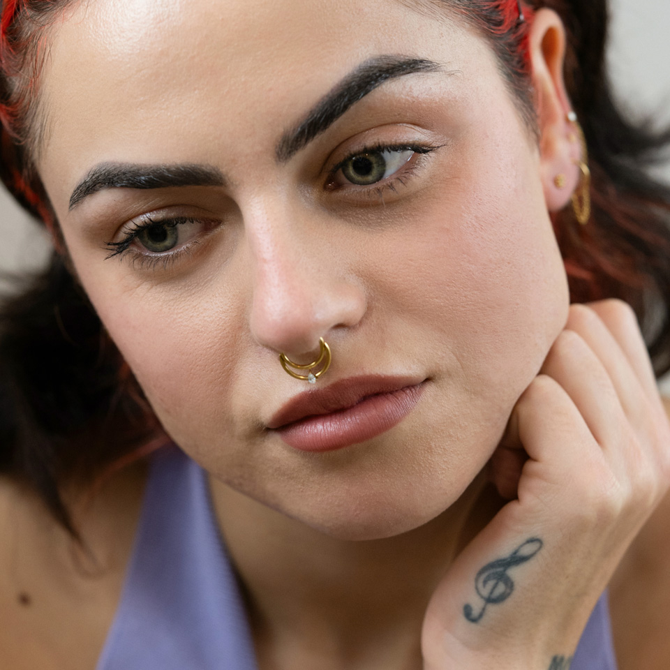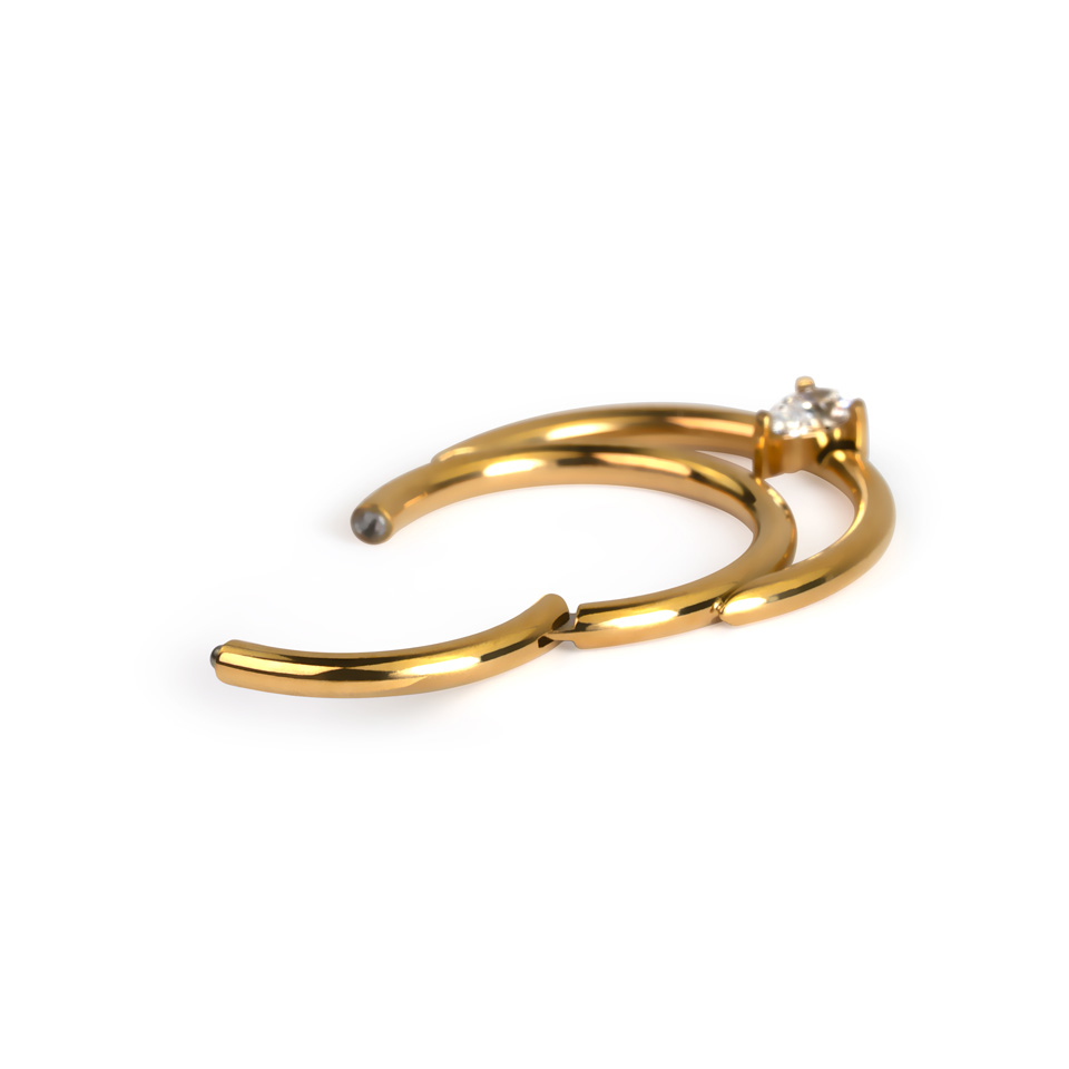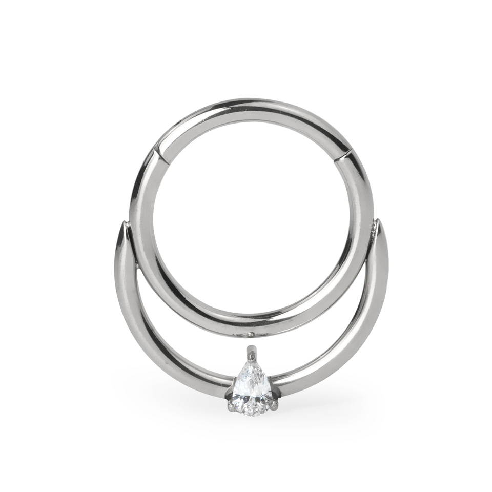Segmentring i titan med gångjärn och tår-formad sten på den yttre ringen. Det här vackra smycket är mer än elegant med en tidlös tårformad sten som sammanför två ringar för att skapa ett unikt smycke. Det finns tillgängligt i både guld- och silverfärger. Smycket har en trådtjocklek på 1,2 mm och kommer i diametrarna 8 och 10 mm, vilket gör smycket perfekt för en helix- daith- eller septumpiercing.