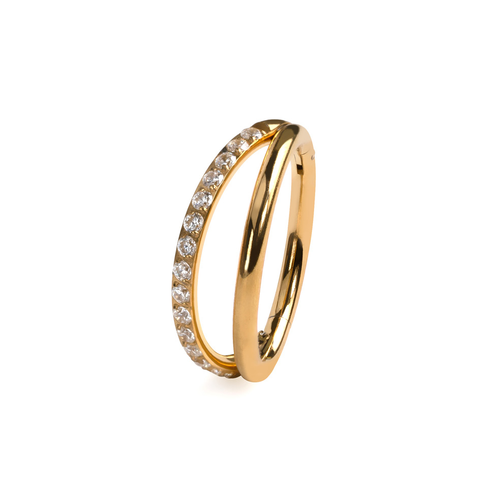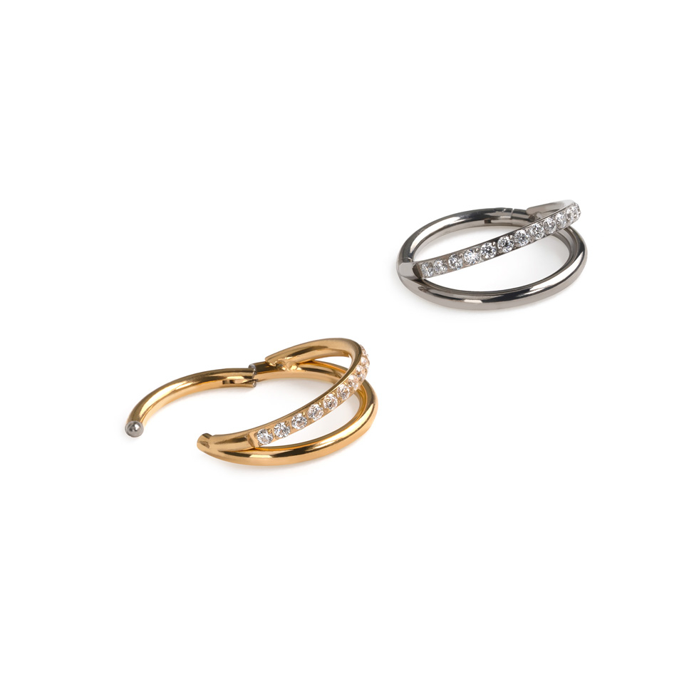 Denna dubbelring i titan med stenar på ena bandet är modernt fräsch med sin dubbla design; ena halvan slät och minimal, andra halvan prydd av stenar. Två humör, en ring.