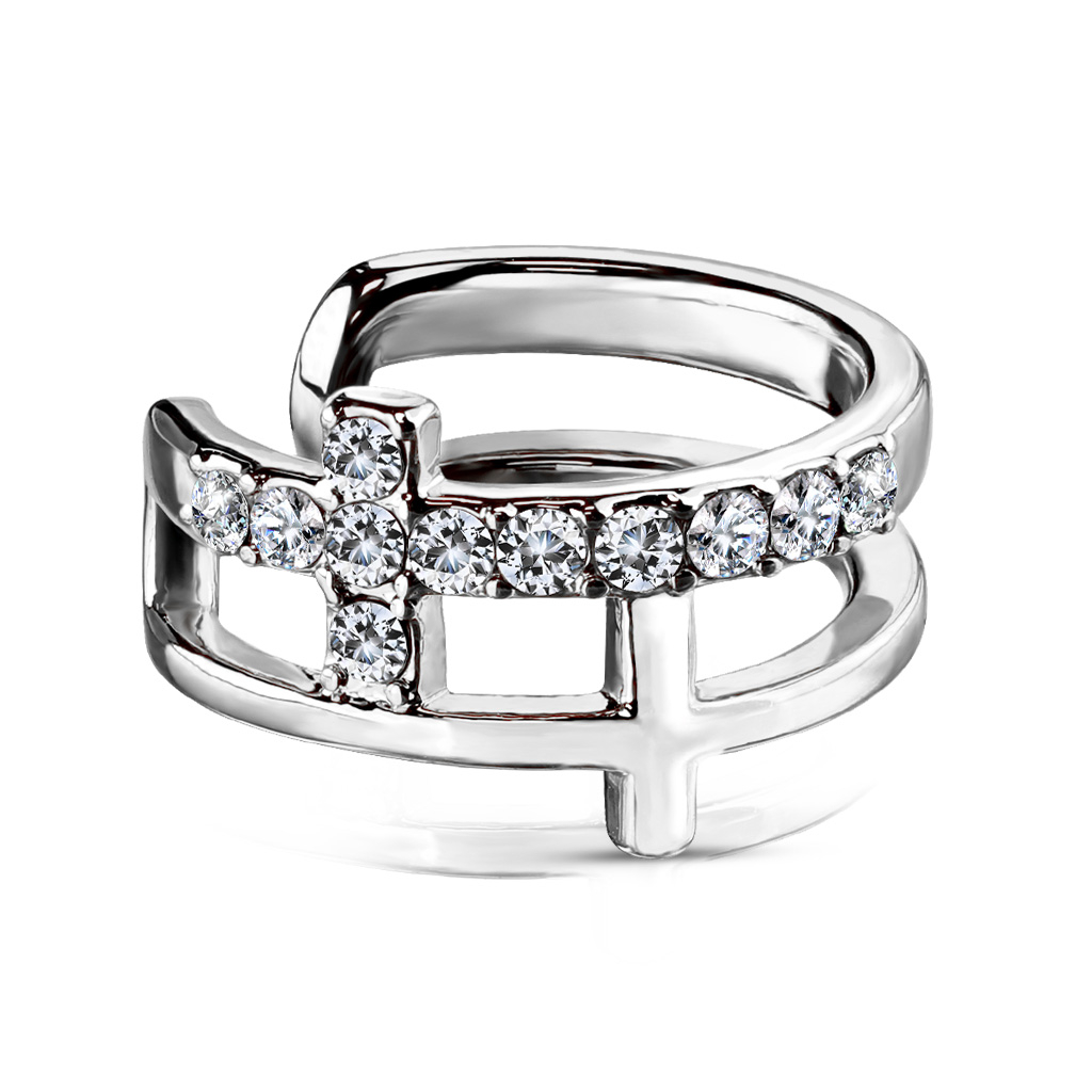 På smycket sitter det två kors med små klara stenar och ett kors utan stenar – de två korsen sitter snett över varandra på den sidan av smycket som kommer sitta främst på ditt öra. Stenarna på det ena korset tillför också elegans till smycket, vilket är tydligt när ljuset träffar dem och de börjar skina.