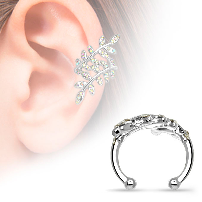 Denna earcuff, som är designad i en riktigt elegant och detaljerad design, finns i tre olika modeller. Du kan välja mellan antingen en blank eller en guldfärgad modell som har helt klara stenar. Alternativt så kan du välja den lite mer raffinerade varianten som är blank med den speciella Aurora Borealis stenen. Detta är en sten som reflekterar alla regnbågens färger i ytan när ljuset träffar den. Det skapar ett helt fantastisk färgspel när man har på sig smycket och rör på sig i ljuset.
