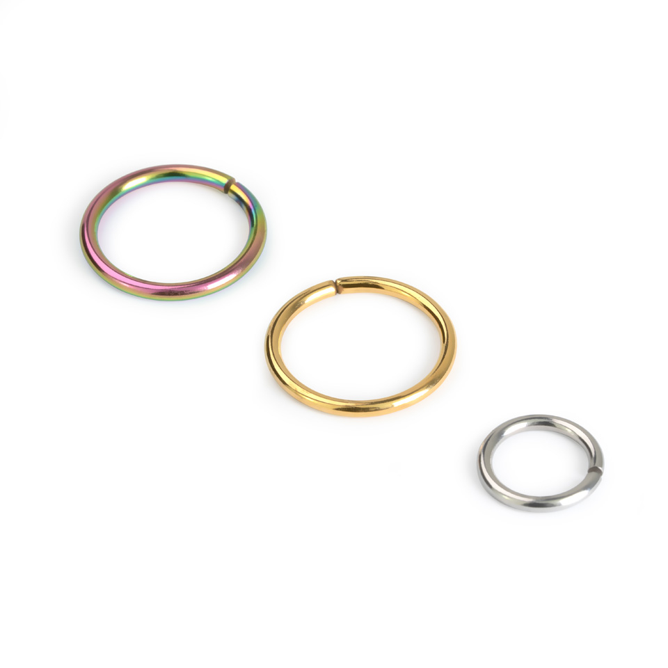 Med denna trådlösa ring kommer det bli enklare att sätta in den i din piercing. Cirkeln består av en enkel bit metall med en liten öppning. För att öpnna ringen behöver du bara skruva ändarna i motsatt riktning som en spiral - dra inte isär dem sidleds. Glid in den i din piercing och släpp taget för att stänga ringen. Notera att ändarna på de mindre modellerna kan vara vassa när de är öppna.