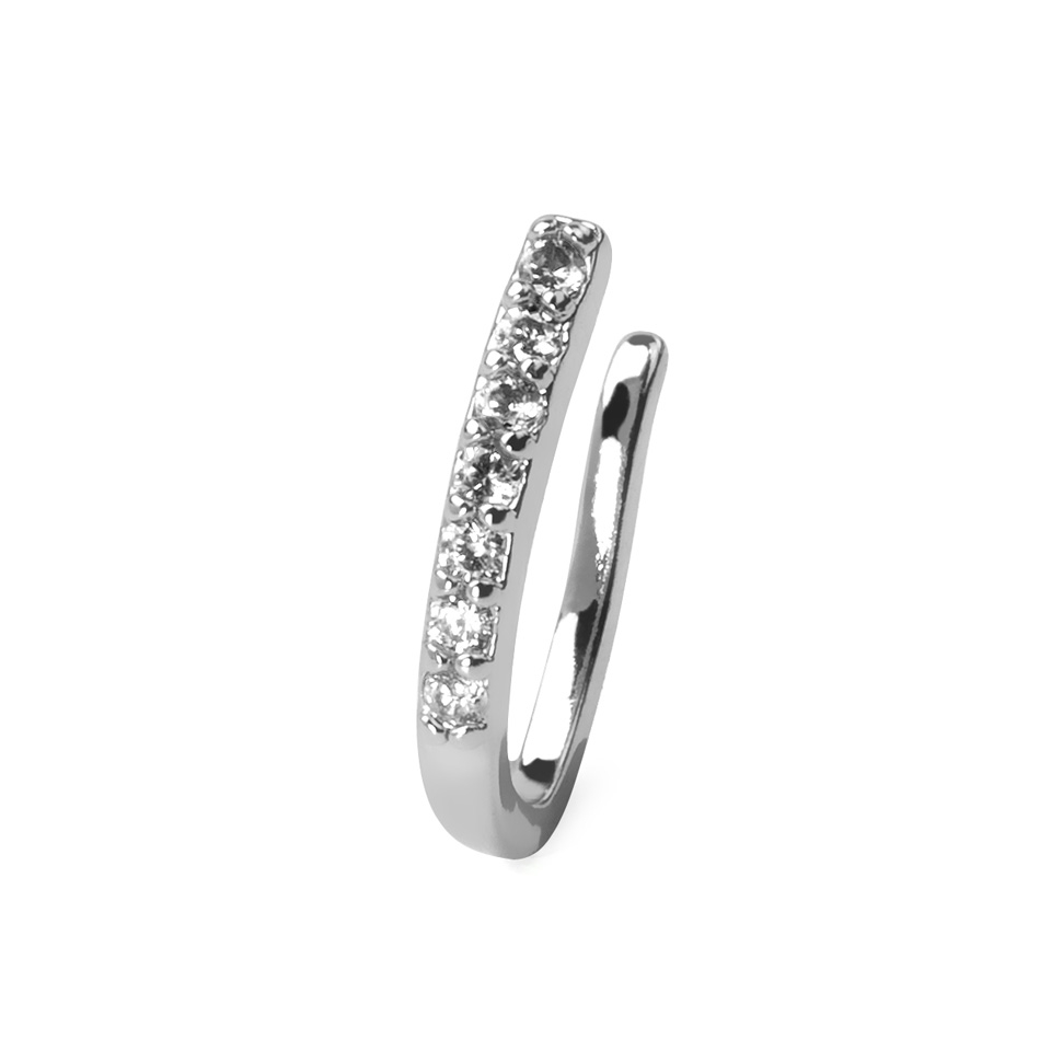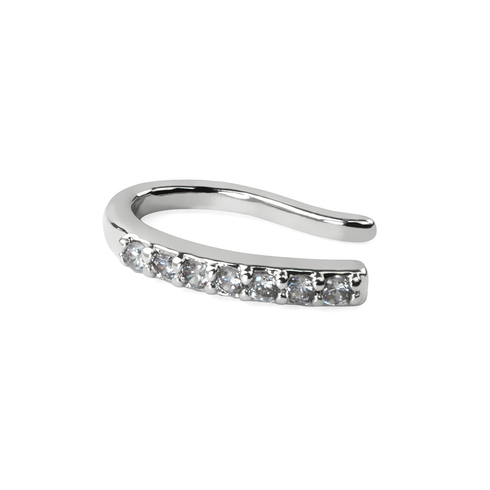 Tjockleken på smycket är ca. 1 mm. och har, precis som du ser på bilden, en rad som består av sju klara stenar. Vi snackar alltså här om ett falskt piercingsmycke som inte faktiskt går igenom huden. Piercingsmycket är tillverkat av mässing och har sedan pläterats så att smycket får en vacker blank yta.