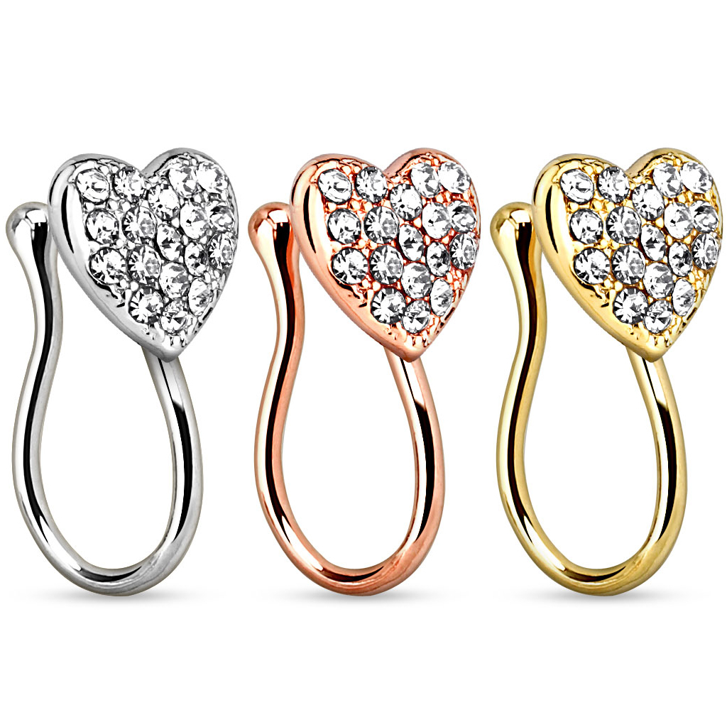 Det här smycket är ett fake smycke och kräver därför ingen piercing. Det fungerar som en liten klämma som sätts på ena näsborren. På avstånd kommer det att se ut som att du har en ring i näsan med ett glittrande hjärta på.