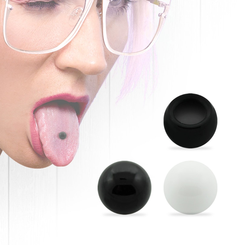 På bilden ovanför ser du en fake tungpiercing. Med det menar vi att du inte behöver ett hål i tungan för att använda den. Med denna falska piercing kan du både känna och se hur det är att ha en tungpiercing innan du skaffa en riktig en. Denna falska tungpiercing finns i två färger, nämligen svart och vitt. Kulan är gjort av akryl, där det finns ett hålrum på ena sidan. Detta hål är med och skapar ett vakuum som gör att kulan kan sitta fast på tungan. Du bara suger luften ut från kulan och därmed skapar ett undertryck.