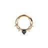 Denna framåtvända ring är designad för att se ut som ståltråd med en hjärtformad svart sten i mitten. Eftersom den är öppnas med gångjärn är den enkel att fästa i din piercing.