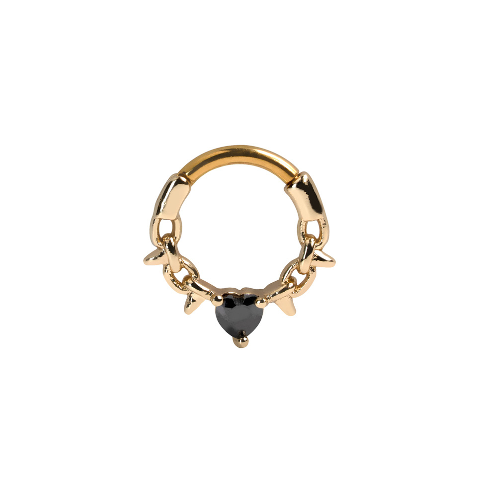 Denna framåtvända ring är designad för att se ut som ståltråd med en hjärtformad svart sten i mitten. Eftersom den är öppnas med gångjärn är den enkel att fästa i din piercing.