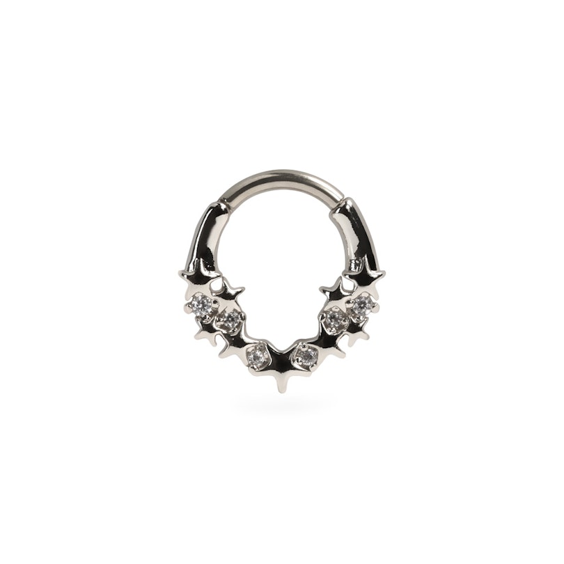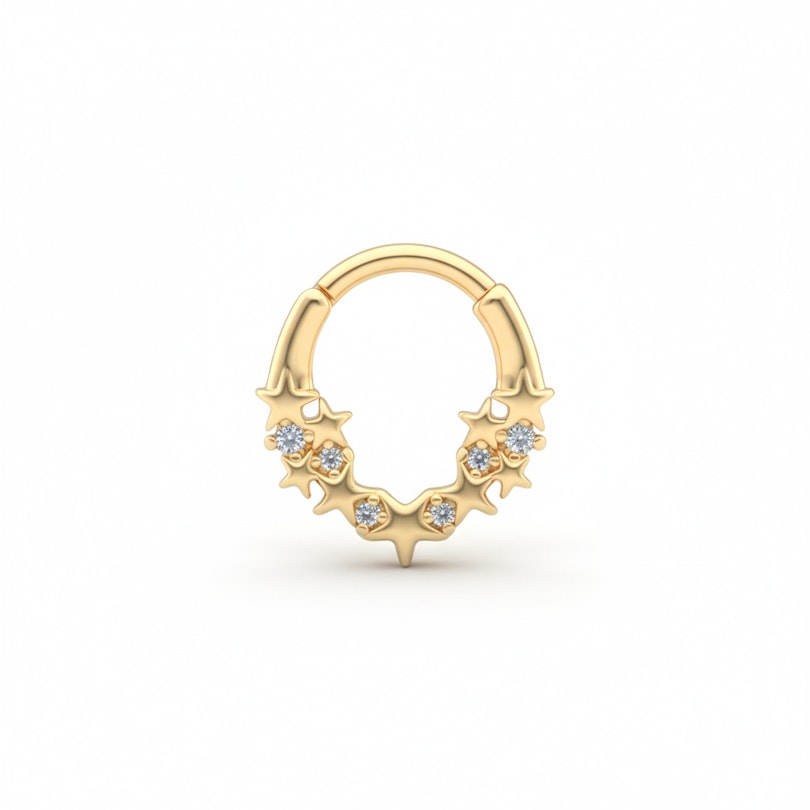Denna framåtvända ring med stjärnor och månar blir ett perfekt tillskott till din samling. Gångjärnslåset gör den enkel att ta på och säkra i din piercing.