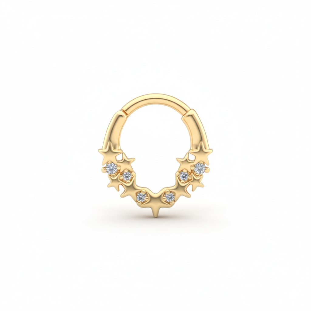 Denna framåtvända ring med stjärnor och månar blir ett perfekt tillskott till din samling. Gångjärnslåset gör den enkel att ta på och säkra i din piercing.