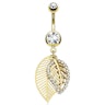 Guldpläterade piercingsmycken av titan ser en aning mer extravagant ut än vanliga smycken av kirurgiskt stål - och denna modell är inget undantag. Med sin snygga guldplätering och de två blad en i hänget där det ena av dem har en sten runt hela kanten, strålar den av lyx och bling bling. Smycket kommer att garanterat pynta en sommerbrun navel.