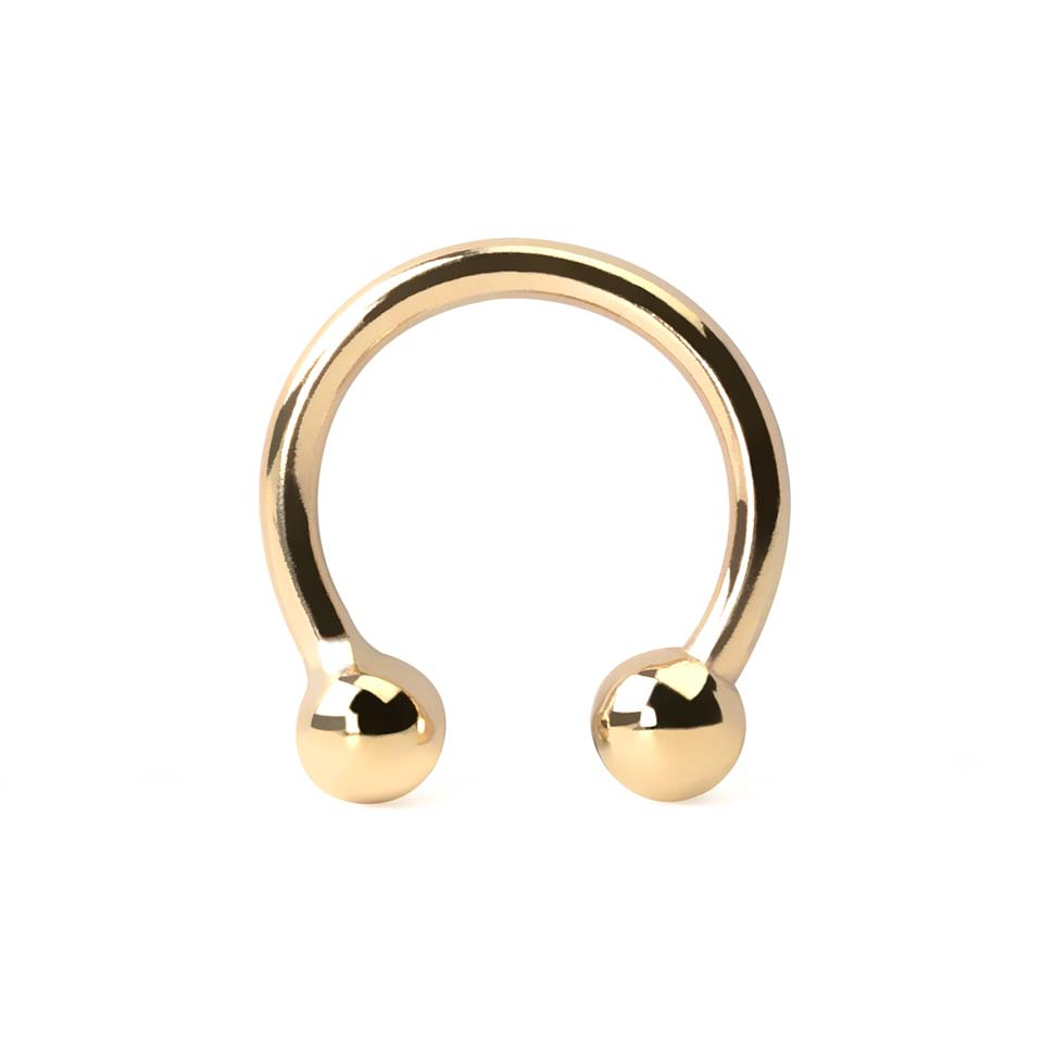 Det är en fantastisk rund barbell eller också kallad hästsko i rent 14 karat guld. Den har en klassisk design med en kula på varje ände. Det är den perfekta ringen för dig som gillar smycken av hög kvalitet med en enkel design. Runda barbells är väldigt mångsidiga, du kan placera den i flera olika kroppspiercingar. De används ofta i näsan, ögonbryn, läpp och intima piercingar.