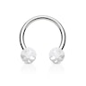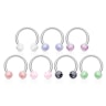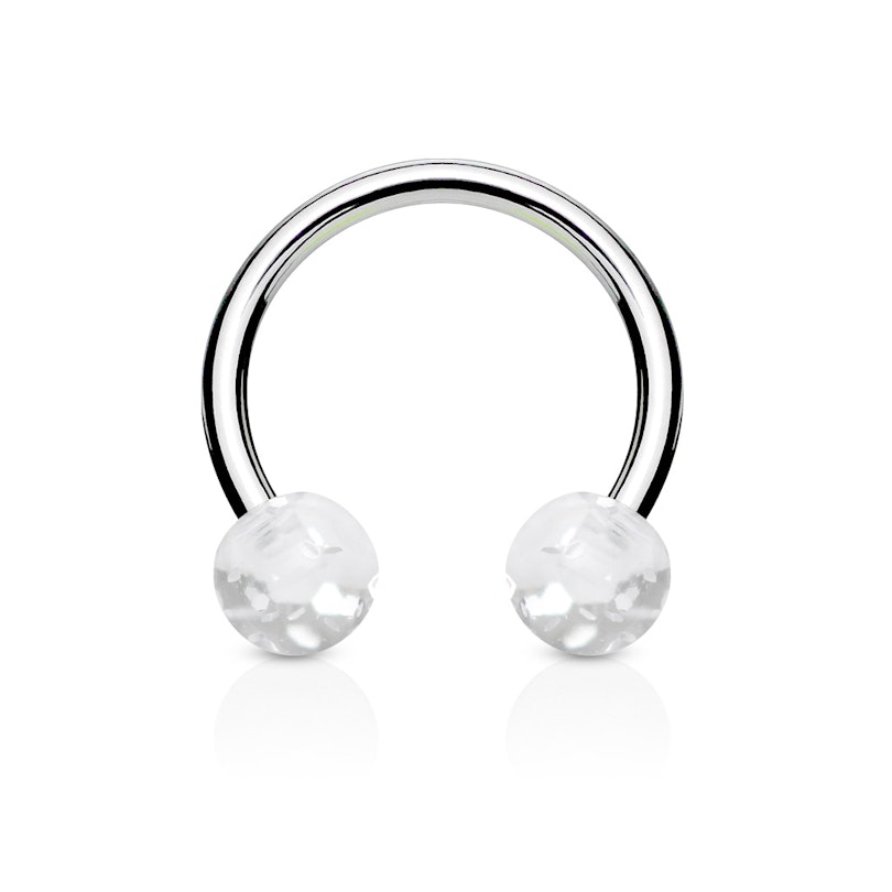 Hästskon är utrustad med två akrylkulor som är färgade i samma färg som glitterflingor. Dessa små glitterflingor gör så att smycket får sin unika look och det innebär också att piercingsmycket inte liknar något annat.