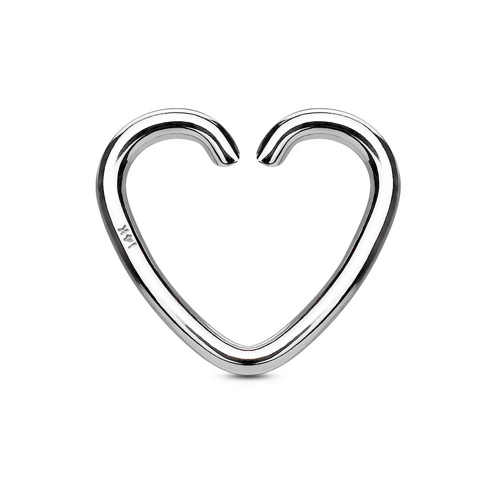 Hjärtat som du ser på bilden är tillverkat i det finaste guldet av 14 karat. Smycket är utformat som ett enda stycke som sedan har blivit böjd på ett sätt som bildar hjärtformen som vi alla känner igen och älskar. Båda smyckets ändar möts högst upp och skapar där hjärtat dippar. Mellanrummet mellan ändarna är ca. 2 mm. För att sätta i smycket ska du försiktigt vrida ändarna från varandra. Genom att göra detta behåller smycket sin elasticitet, vilket det inte kommer att göra om du istället drar ändarna från varandra. När piercingen väl sitter på plats ska du sedan bara försiktigt vrida tillbaka ändarna till deras första position.