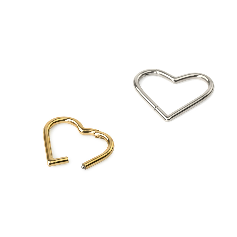 Den här ringen med gångjärn har en av våra favoritformer: ett hjärta. Om du är ute efter ett smycke som är både elegant och har en fin betydelse, då har du kommit rätt. Ringen öppnas med ett gångjärn som gör livet enkelt för dig. Dra bara upp segmentet med gångjärnet, sätt i smycket och stäng det igen. Du kan bära det här vackra hjärtat i flera olika näs-eller öronpiercings.