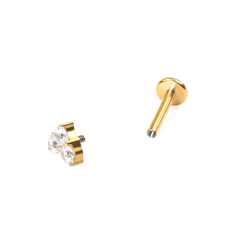 Denna titanlabret har 3 CZ-stenar arrangerade så de formar ett hjärta. De två översta stenarna är runda och den nedersta är fyrkantig. Smycket har en invändig tråd och finns i färgerna guld eller silver. Detta gulliga smycke kommer se fantastiskt ut i en rad olika öronpiercingar. Den är bara 5 mm som bredast. Den platta baksidan gör den bekväm att använda.