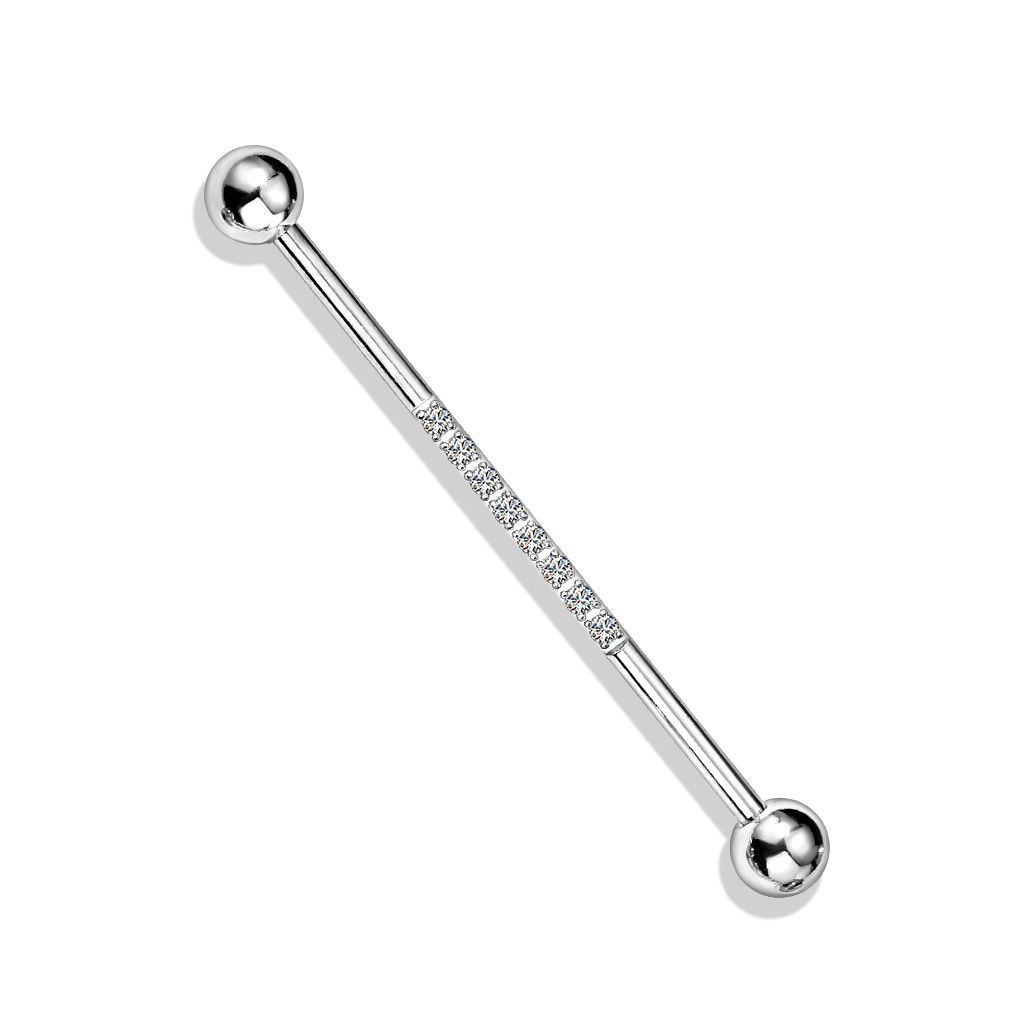 Har du en industrial piercing i örat så har vi smycket till dig. Smycket består av en rak stav med två kulor - en i varje ände. Mitt på staven finns det en liten fördjupning där det placerats 8 små stenar med en perfekt precision. Staven är gjord av kirurgiskt stål och finns i flera olika färger och detsamma stenarna. Det är dock bara den blanka silverfärgade utgåvan som kan väljas med andra stenfärger än klar, med andra ord, den färgade staven kan endast väljas med klara stenar.
