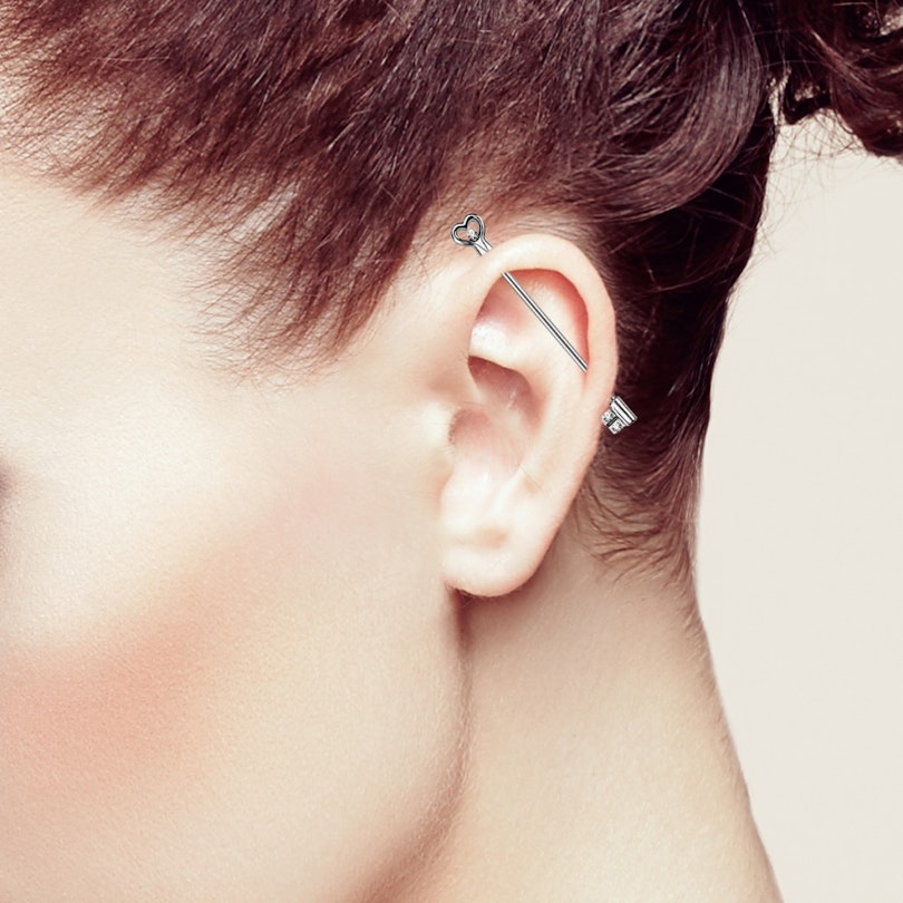 Materialet är kirurgiskt stål, vilket är ett väldigt flitigt använt piercingsmyckematerial dels på grund av dess slitstarka kvaliteter och dels på grund av den snygga blanka looken. Du sätta in smycket genom att skruva av både hjärthandtaget och nyckeldelen och föra staven genom hålet i örat - innifrån och ut. Så snart staven sitter där den ska skruvar du enkelt igen båda sluten. Så skynda dig att köp den snygga nyckeln som säkert kommer att hålla alla dina hemmeliger under lås och bom när du sätter den på plats i ditt öra.
